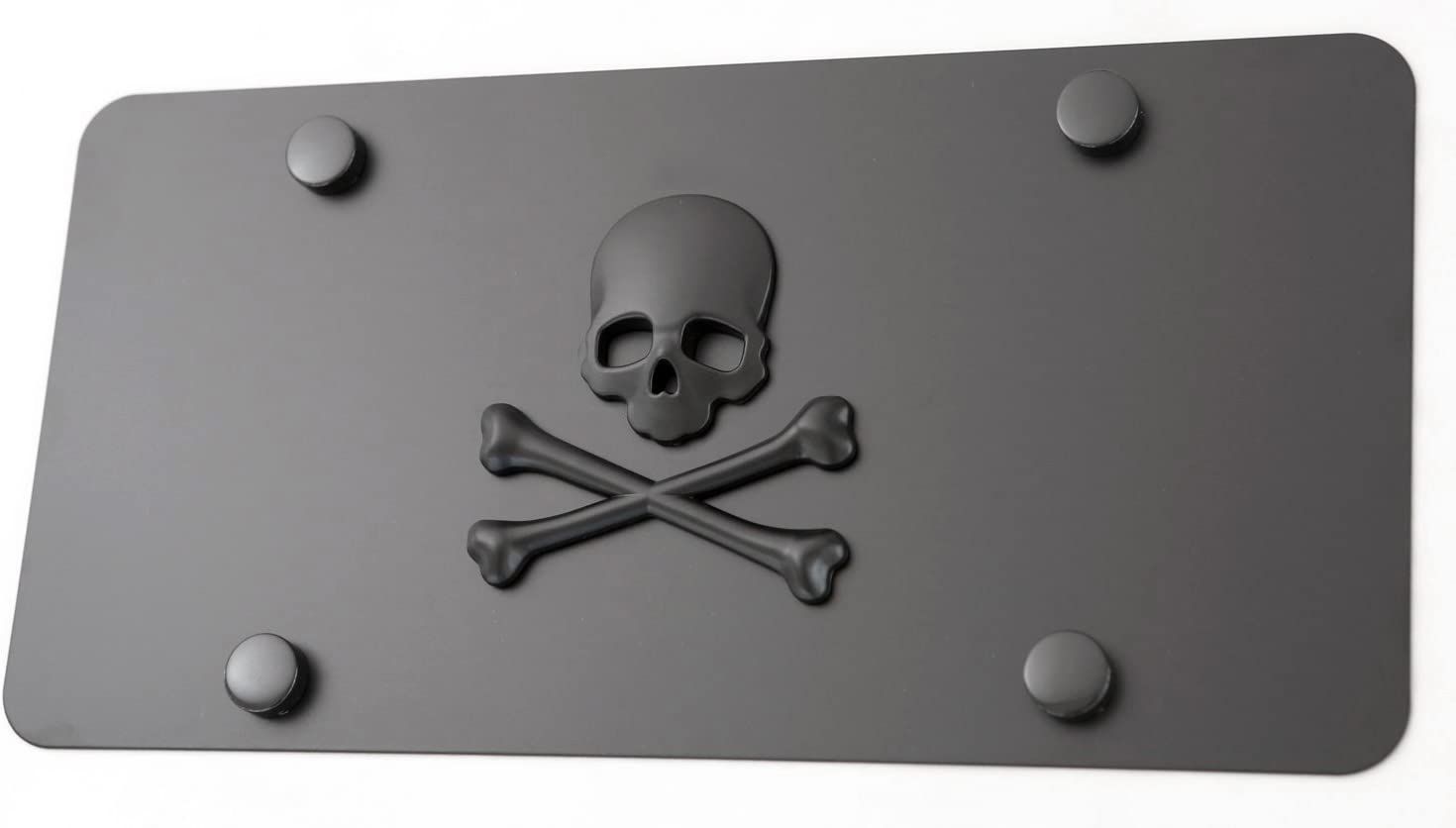 LFPartS Skull 3D Metal Black Crossbones Emblem on Black Stainless Steel License Plate